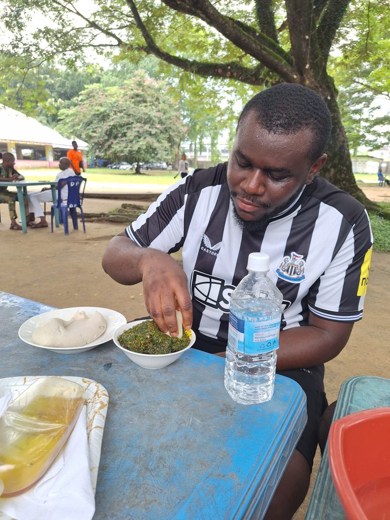 I had just finished a session with Mathew Edafe and his Elegbete TV when we rushed off to Discovery Park to grab some food. Femi and Clarkson had Afang soup and they marvelled at the difference between that one and what we buy in Port Harcourt. Carl had Egusi soup and he was asked why he would travel from Port Harcourt to Uyo and have a soup that is regular in his town. Ghanaman and Olisa went for White soup (Afiya fiyere) while I wanted jollof rice. They asked why, and I told them I had not had a meal yet all through the day and it was already 3 pm. If I start with something heavy, I will have a crisis. Mine was the last to arrive. As I put in the fork and tasted the rice, my mouth was filled with water. It was as though the rice drowned in the pot of water while cooking it. I would not eat that nonsense. I called the waiter to take it away. She was concerned and asked me why. I told her plainly that if she ate it, she would know it was not worth it. I then ordered white soup and white rice and it was a better deal. Then we were off to the stadium to pick up our accreditation tags and then attend the pre-match presser.